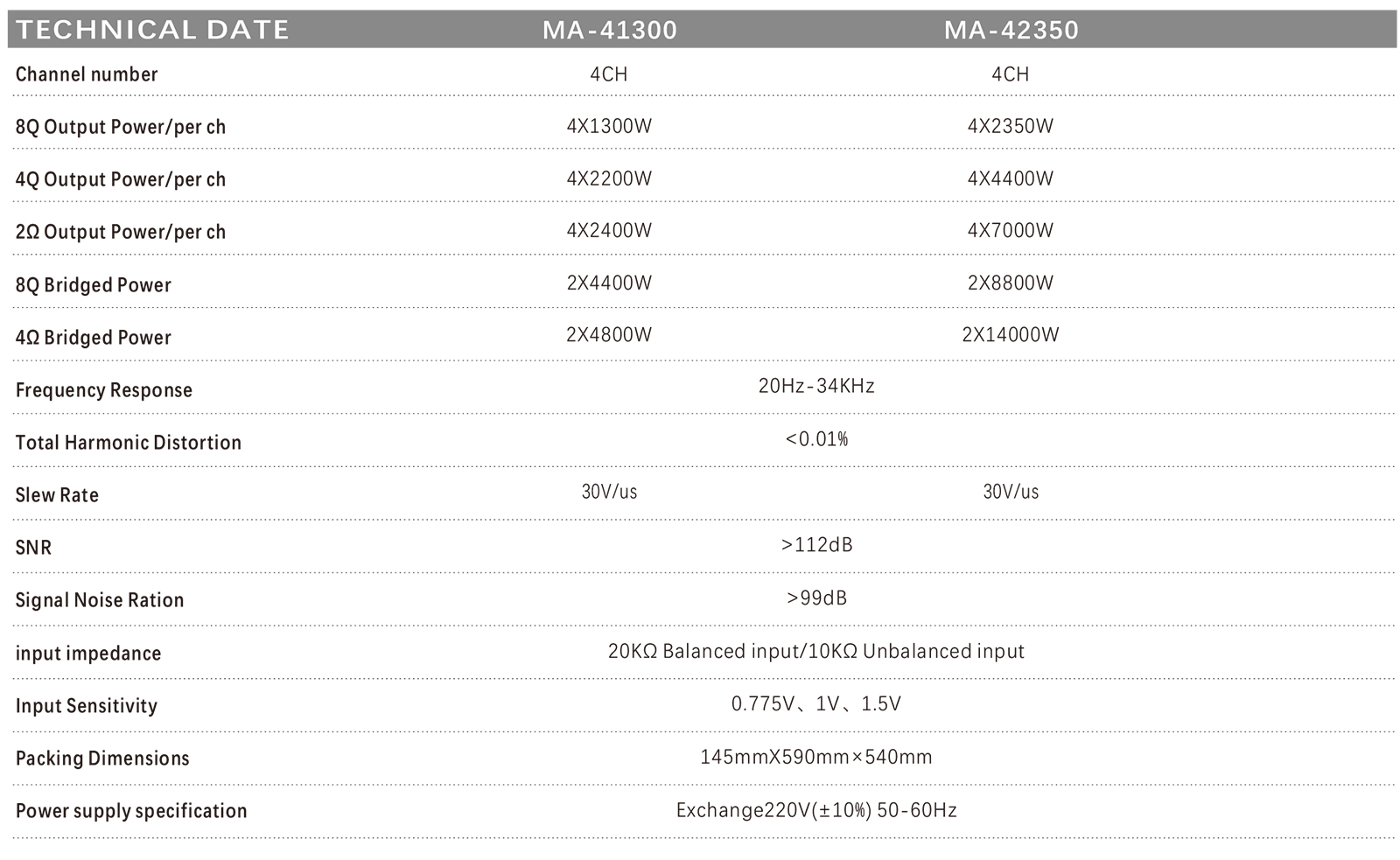 Switching power supply adopts the classic pulse width modulation amplification circuit, so that the static power consumption of the whole machine is low, the dynamic energy is abundant, and the sound performance is perfect. It is suitable for bars, electro-s ound party rooms and gymnasiums.