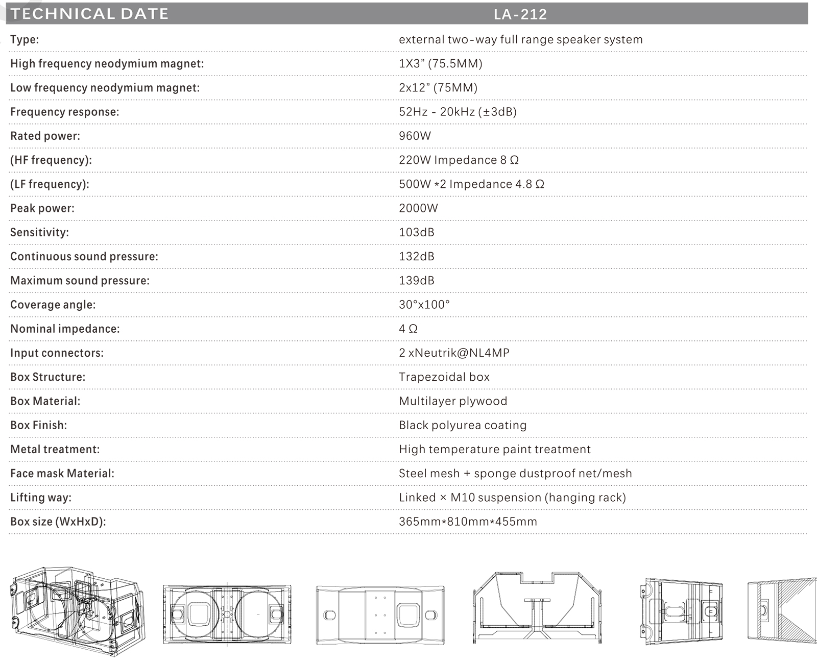 The cabinet adopts a precisely calculated trapezoidal shape design, which optimizes the volume and weight.The linear hanging is simple, fast and easy to install, which greatly saves time. Equipped with a professional line array hanging system device,There are two comfortable handles on the side and back, and two NL4MP plugs on the back. The mask uses a molded steel iron mesh with high sound transmittance. The design is clever and compact,truly realizing small size and high energy.