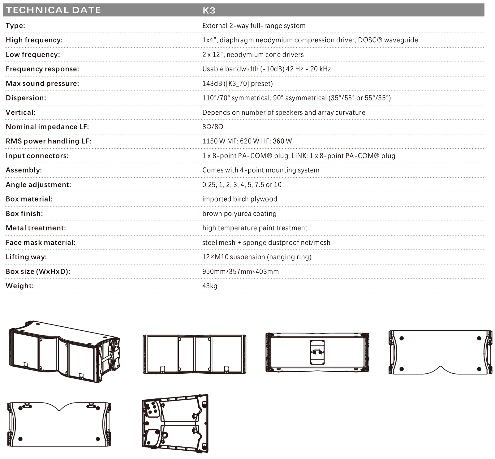 K3 uses K1 wavefront correction technology and is adapted for both fixed installation and touring applications,i.e. theatres and stadiums. K3 can be used with K1-KS28 subwoofer or as a K1 fill speaker to form a standalone system with an unprecedented performance/weight ratio. Thanks to the quick and easy rigging system, on-site installation is easy and fast. The angle between each box can be adjusted up to 10° to optimize vertical coverage and SPL distribution. Horizontally, K2 has 4 coverage patterns: 2 symmetrical methods (70° or 110°) and 2